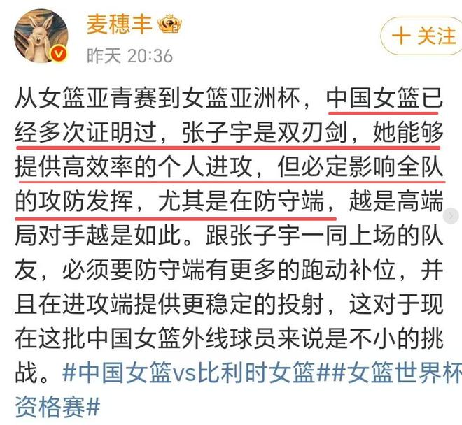媒體人和球迷在點贊張子宇的同時,也大批中國女籃的打法,大批宮魯鳴的戰術,甚至張子宇也遭到吐槽。有球迷說,這樣的打法,即使張子宇轟30分也沒用。媒體人麥穗豐吐槽張子宇是雙刃劍,他說,“從女籃亞青賽到女籃亞洲杯,中國女籃已經多次證明過,張子宇是雙刃劍,她能夠提供高效率的個人進攻,但必定影響全隊的攻防發揮,尤其是在防守端,越是高端局對手越是如此。跟張子宇一同上場的隊友,必須要防守端有更多的跑動補位,并且在進攻端提供更穩定的投射,這對于現在這批中國女籃外線球員來說是不小的挑戰。”
