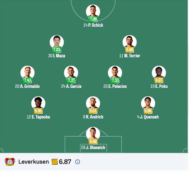 勒沃庫森預計以3-4-2-1陣型應戰:門將布拉斯維希;三中衛寬薩、安德里希、塔普索巴;中場波庫、帕拉西奧斯、加西亞、格里馬爾多;前腰蒂爾曼、馬扎;前鋒科法內。弗萊肯、塞吉爾、巴代、巴斯克斯、阿圖爾等多名球員缺陣。