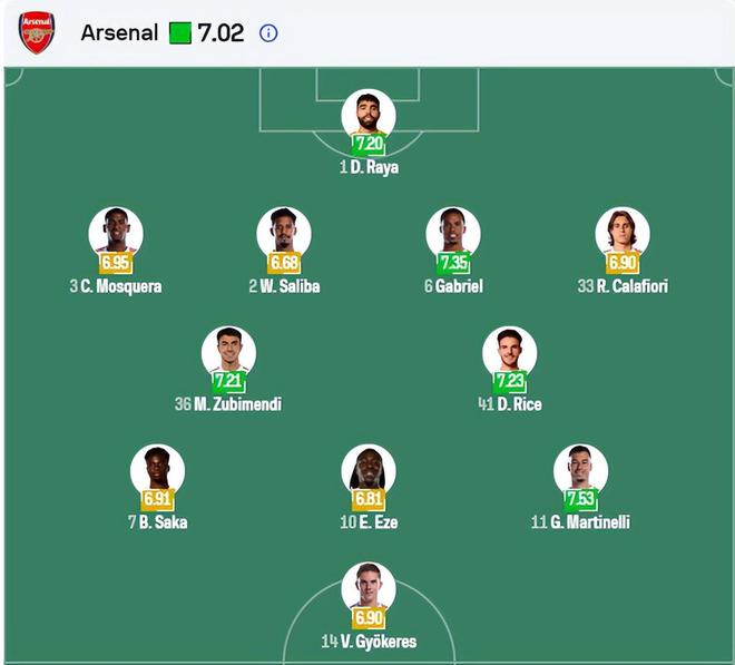 根據機構預測,阿森納將排出4-2-3-1陣型:門將拉亞;后防線由莫斯克拉、薩利巴、加布里埃爾和因卡皮耶組成;雙后腰賴斯搭檔蘇比門迪;攻擊線上薩卡、埃澤、馬丁內利支援中鋒哲凱賴什。梅里諾、厄德高、廷伯繼續傷缺。